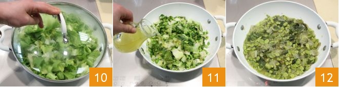 und kochen Sie einige Minuten mit Deckel 10, um die Endivien weicher zu machen. Geben Sie die Gemüsebrühe hinzu 11 und kochen Sie mit Deckel weiter für 15 Minuten oder bis das Gemüse weich ist. Nach dem Garen 12