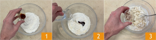 Beginnen Sie mit der Zubereitung des genuesischen Fladenbrots: Geben Sie in eine Schüssel das Mehl, das Malz 1 und die Hälfte der Wassermenge 2. Beginnen Sie mit einer Gabel zu kneten; sobald die Flüssigkeit aufgenommen ist, fügen Sie ein wenig Wasser und die zerbröselte Hefe hinzu 3.