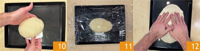 Nach Ablauf der Ruhezeit ölen Sie ein Backblech und legen den Teig darauf 10, dann ölen Sie auch die Oberfläche des Teiges. Decken Sie ihn mit Frischhaltefolie ab 11 und lassen ihn 50 Minuten bei Raumtemperatur gehen. Nach dieser Zeit dehnen Sie den Teig mit den Händen im Blech aus 12.