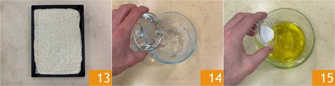 Sie müssen die gesamte Oberfläche bedecken; wenn der Teig zu elastisch ist, decken Sie ihn erneut mit Frischhaltefolie ab und lassen ihn weitere 15 Minuten ruhen. Einmal ausgedehnt, muss das Fladenbrot 2 Stunden im ausgeschalteten Ofen mit eingeschaltetem Licht gehen. In der Zwischenzeit bereiten Sie die Salzlake vor: Geben Sie in eine Schüssel das Wasser 14, das Öl und das Salz 15.