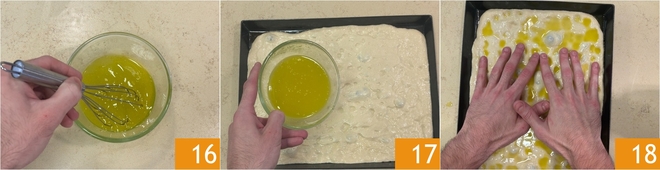 Emulgieren Sie mit einem Schneebesen. Nach den 2 Stunden Gehzeit verteilen Sie den größten Teil der Salzlake über das Fladenbrot 17, wobei Sie darauf achten, ein paar Esslöffel für nach dem Backen zurückzuhalten. Drücken Sie den Teig mit den Fingerspitzen, um die charakteristischen Löcher zu formen 18.