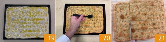 Lassen Sie ihn weitere 15 Minuten bei Raumtemperatur gehen 19. Backen Sie ihn im vorgeheizten statischen Ofen bei 240° für 18-20 Minuten. Sobald er gebacken ist, nehmen Sie ihn heraus und bestreichen die Oberfläche mit der zurückgehaltenen Salzlake 20. Schneiden Sie das genuesische Fladenbrot in Streifen und legen Sie es beiseite 21.