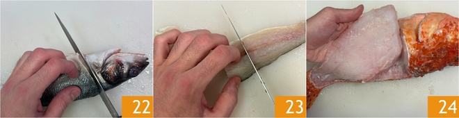 Für die Zubereitung der Bouillabaisse beginnen Sie mit der Reinigung des Fisches, wobei Sie darauf achten, alle Abfälle aufzubewahren. Wie man den Wolfsbarsch reinigt: Entfernen Sie den Kopf 22, schneiden Sie den Rücken ein und entnehmen Sie die Innereien, dann schneiden Sie die Filets ab 23, entfernen Sie die Gräten und schneiden Sie die Filets in kleine Stücke 23. Wie man den Drachenkopf reinigt: Entfernen Sie die Flossen und den Kopf, filetieren Sie 24 und schneiden Sie den Bauch ab.