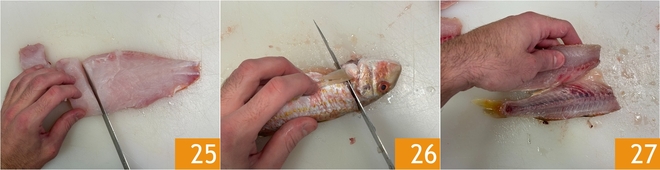 Teilen Sie auch die Filets des Drachenkopfs in kleinere Stücke 25. Bearbeiten Sie die Rotbarben: Entfernen Sie den Kopf 26, schneiden Sie den Rücken ein und öffnen Sie sie wie ein Buch, um die Filets zu erhalten 27, dann entfernen Sie den Bauch. Auch hier schneiden Sie in Stücke.