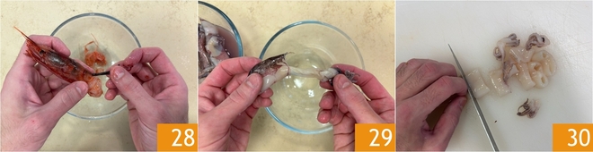 Wie man Garnelen reinigt: Entfernen Sie den Panzer, lassen Sie dabei Kopf und Schwanz, dann entnehmen Sie den Darm und legen Sie sie beiseite 28. Zum Schluss Wie man Tintenfische putzt, indem Sie den inneren Knorpel und die Innereien entfernen 29, dann schneiden Sie sie in Streifen 30.