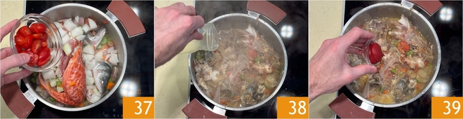 Bedecken Sie mit einem Deckel und kochen Sie bei niedriger Hitze für 40 Minuten 43. Am Ende der Garzeit 44, filtern Sie den Fischfond 45 und bewahren ihn auf.