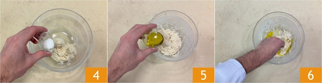 Rühren Sie weiter, indem Sie nach und nach das restliche Wasser hinzufügen. Geben Sie nun das Salz 4 und die Hälfte des Öls 5 hinzu, dann beginnen Sie, von Hand zu kneten 6.