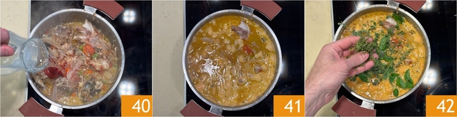 Bedecken Sie mit Wasser 40 und rühren Sie, um das Tomatenmark aufzulösen 41, würzen Sie dann mit den aromatischen Kräutern: Basilikum, Majoran und Thymian 42.