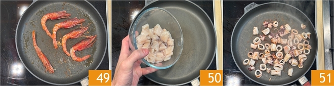 Braten Sie auch diese goldbraun an 49 und legen Sie sie beiseite. In derselben Pfanne braten Sie die Tintenfische 50 goldbraun an 51, dann legen Sie sie beiseite.