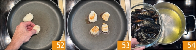 Legen Sie in derselben Pfanne die Jakobsmuscheln 52 und braten Sie sie goldbraun an 53. Legen Sie auch diese beiseite. Bearbeiten Sie die Miesmuscheln: In einem Topf erhitzen Sie einen Schuss Öl, dann geben Sie die gesäuberten Miesmuscheln hinein 54.