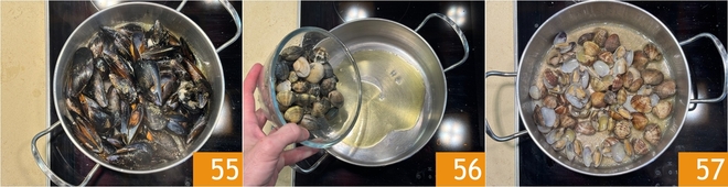 Bedecken Sie mit einem Deckel und kochen Sie bei starker Flamme, bis sie sich geöffnet haben 55. Machen Sie dasselbe mit den Venusmuscheln 56 und kochen Sie nur so lange, bis sie sich öffnen 57.