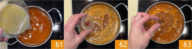 Nun geben Sie dem Fischfond 300 g des Kochwassers der Miesmuscheln und Venusmuscheln hinzu 61, dann bringen Sie ihn erneut zum Kochen und aromatisieren mit dem Safran 62 und dem Sternanis 63.