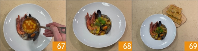 Bedecken Sie mit dem Fischfond 67 und vervollständigen Sie mit Basilikumblättern, wildem Fenchel und Pistazienmehl 68. Ihre Bouillabaisse mit genuesischem Fladenbrot ist bereit, serviert zu werden 69!