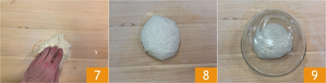Sobald das Öl aufgenommen ist, übertragen Sie den Teig auf die Arbeitsfläche 7, falten Sie den Teig, indem Sie ihn ziehen und auf sich selbst falten, und fügen Sie nach und nach das restliche Öl hinzu. Wenn Sie einen glatten und homogenen Teig erhalten haben 8, decken Sie ihn mit der Schüssel ab und lassen ihn 15 Minuten bei Raumtemperatur ruhen 9.