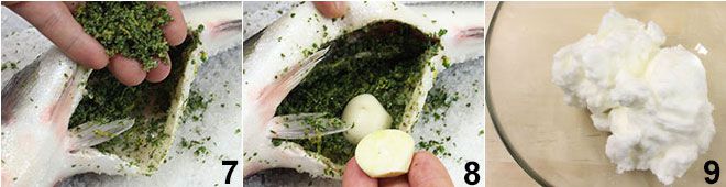 Verwenden Sie einen Teil der gerade zubereiteten Mischung, um den Bauch des Fisches zu füllen 7 und fügen Sie 2 geschälte Knoblauchzehen hinzu 8. Gehen Sie nun zur Salzkruste über: Schlagen Sie das Eiweiß steif und geben Sie es in eine Schüssel 9.