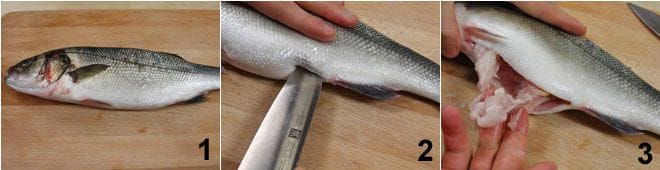 Um den Wolfsbarsch in Salzkruste mit Kräutern und Bier zuzubereiten, beginnen Sie damit, den Wolfsbarsch zu ausnehmen 1, indem Sie das Messer in das Loch in der Nähe des Schwanzes 2 stechen und bis zum Kopf schneiden. Entfernen Sie die Innereien 3 und spülen Sie den Wolfsbarsch unter fließendem Wasser ab.