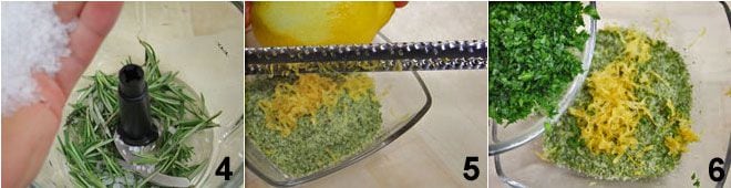 Hacken Sie die Kräuter mit einer Prise grobem Salz 4, reiben Sie die Schale einer halben Zitrone in die Mischung 5 und fügen Sie zuletzt die fein gehackte Petersilie hinzu 6.