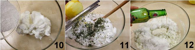 Heben Sie vorsichtig das feine und grobe Salz 10, die übrig gebliebene Kräutermischung und die geriebene Schale der anderen Zitronenhälfte unter das Eiweiß 11, dann fügen Sie so viel Bier hinzu 12, dass eine dichte und cremige Masse entsteht.