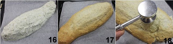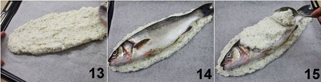Legen Sie ein Blatt Backpapier auf ein Backblech (oder eine Form) und geben Sie dann eine dünne Schicht (ca. 1,5 cm) der erhaltenen Mischung darauf, die das Bett für den Wolfsbarsch bildet 13. Legen Sie den Wolfsbarsch auf das Salzbett 14 und bedecken Sie ihn mit der Salzmasse, indem Sie ihn vorsichtig andrücken, damit die Mischung gut haftet 15.