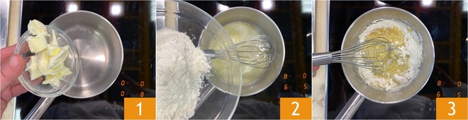 Um die Gravy-Soße zuzubereiten, stellen Sie zunächst die Fleischbrühe nach unserem Rezept her. Sobald die Brühe fertig ist, geben Sie die Butter in einen kleinen Topf und lassen Sie sie bei niedriger Hitze sanft schmelzen 1, um eine glatte und gleichmäßige Basis zu erhalten. Sobald die Butter vollständig geschmolzen ist, fügen Sie das Mehl 2 hinzu und rühren sofort mit dem Schneebesen, um die Mehlschwitze 3 zu machen.