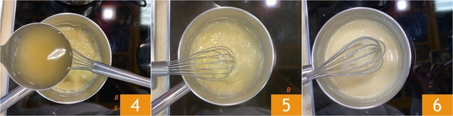 Arbeiten Sie weiterhin bei mittlerer Hitze, während Sie ständig rühren, bis die Mehlschwitze leicht bräunlich wird und eine schöne Farbe annimmt. Fügen Sie nun die heiße Fleischbrühe nach und nach hinzu 4, gießen Sie sie langsam ein und rühren Sie energisch um, um die Bildung von Klumpen zu vermeiden 5. Sie werden sehen, je mehr Brühe Sie hinzufügen, desto mehr wird die Soße eindicken, ähnlich wie eine Béchamelsoße, und sie wird weich und glänzend. Kochen Sie weiter, bis Sie eine samtige und gleichmäßige Creme erhalten 6.