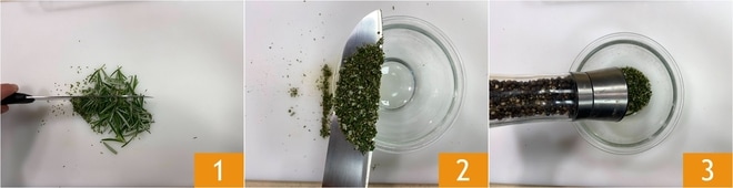 Um das Brathähnchen mit gedrehtem Gemüse vorzubereiten, legen Sie zuerst Thymian und Rosmarin auf ein Schneidebrett. Hacken Sie sie fein 1 und geben Sie sie in eine kleine Schüssel 2, dann fügen Sie den Pfeffer hinzu 3.