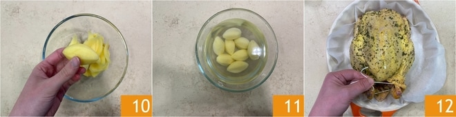 Sie sollten eine runde Form mit spitzen Enden erhalten 10. Geben Sie die Kartoffeln nach und nach in eine Schüssel mit Wasser, um sie vor dem Anlaufen zu schützen 11. Legen Sie dann das Hähnchen in eine Auflaufform und binden Sie die Keulen mit Küchengarn zusammen 12.