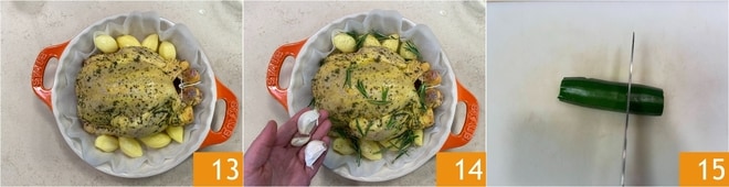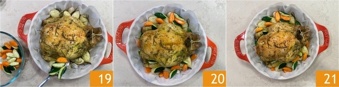 Nach einer Stunde Garzeit legen Sie auch dieses Gemüse neben das Hähnchen 19, indem Sie es rundherum verteilen, ohne es zu überlappen 20. Backen Sie es weitere 15-20 Minuten. Nehmen Sie es aus dem Ofen und servieren Sie Ihr Brathähnchen mit gedrehtem Gemüse 21!