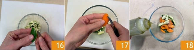 Drehen Sie sowohl die Zucchini 16 als auch die Karotten 17 wie bei den Kartoffeln. Geben Sie sie in eine Schüssel und würzen Sie sie mit Salz, Pfeffer und Öl.