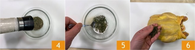 Fügen Sie auch das Salz hinzu 4 und vermischen Sie alles 5. Verwenden Sie diese Mischung, um das Hähnchen sowohl außen als auch innen zu würzen 6.
