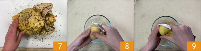 Massieren Sie es gut ein, damit die Aromen gleichmäßig eindringen 7, dann ölen Sie die Oberfläche ein. Widmen Sie sich den Kartoffeln: Schälen Sie sie 8 und drehen Sie sie mit einem kleinen Messer 9.