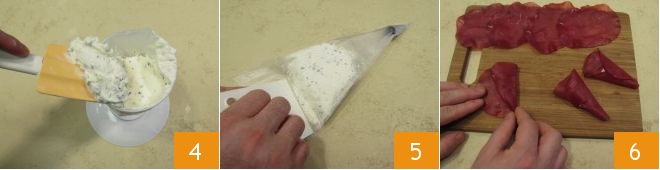 Mit einem Spatel die Zutaten gut vermengen, um sie gleichmäßig zu mischen, und die Mischung in einen Einweg-Spritzbeutel füllen, an dem Sie eine ziemlich große glatte Tülle anbringen 4. Sie können sich beim Einfüllen der Füllung in den Spritzbeutel mit einem Spatel helfen und ihn nach unten drücken 5. Danach wenden Sie sich dem Bresaola zu. Legen Sie die Bresaola-Scheiben auf ein Schneidebrett und schließen Sie sie, indem Sie die Enden zusammenführen, um ein kleineres Loch an einem Ende und eine größere Öffnung am anderen Ende zu erhalten, bis sie die Form eines Kegels annehmen 6.