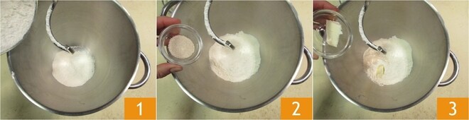 Um die Brezel zuzubereiten, geben Sie das gesiebte Mehl in eine Küchenmaschine mit Haken 1. Fügen Sie auch die Trockenhefe 2 und die weiche Butter bei Raumtemperatur hinzu 3.