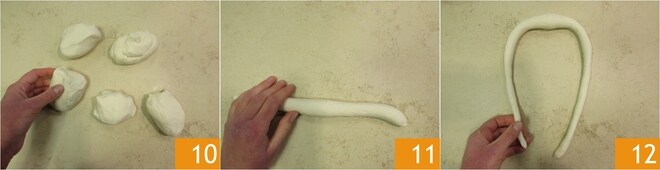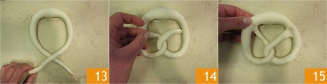 Geben Sie dann der Schnur die typische "lockere Knotenform". Kreuzen Sie die beiden Enden 13 und falten Sie sie nach innen 14. Drücken Sie dann den Teig, um ihn mit der mittleren Schnur zu verbinden 15.