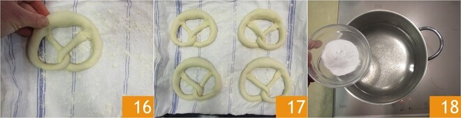 Legen Sie sie auf ein gut bemehltes Tablett 16 und fahren Sie so fort, bis Sie alle fertig haben. Lassen Sie sie 30 Minuten gehen 17, dann stellen Sie sie eine Stunde in den Kühlschrank. Kurz bevor die Stunde verstrichen ist, bringen Sie das Wasser zum Kochen, und wenn es kocht, fügen Sie das Natron hinzu 18.