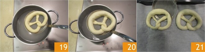 Mit einem Schaumlöffel helfen, den ersten Brezel ins kochende Wasser geben 19, etwa 30-40 Sekunden warten, bis sie glänzend sind. Dann gut abtropfen lassen 20 und auf ein mit Backpapier ausgelegtes Blech legen 21.