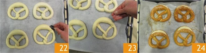 Ritzen Sie die Brezel an der Unterseite, der dickeren Seite, mit einem langen Schnitt ein 22. Mit Salzflocken bestreuen 23 und bei 220° im vorgeheizten statischen Ofen 20 Minuten backen. Wenn sie gut gebräunt sind, herausnehmen 24 und servieren.