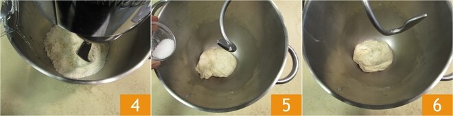 Beginnen Sie, den Teig zu bearbeiten, indem Sie den Haken auf niedriger Geschwindigkeit einschalten und das Wasser bei Raumtemperatur in einem dünnen Strahl hinzugeben 4. Nachdem Sie das Wasser hinzugefügt haben, lassen Sie den Teig noch ein paar Minuten arbeiten, bis er kompakt ist. Fügen Sie dann das Salz hinzu 5 und arbeiten Sie noch ein paar Minuten bei mittlerer Geschwindigkeit 6, bis der Teig gut verbunden ist.