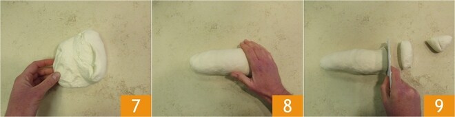 Übertragen Sie ihn auf die Arbeitsfläche 7 und formen Sie mit den Händen eine Rolle 8. Verwenden Sie einen Teigschaber, um Stücke von 100 g zu schneiden 9,