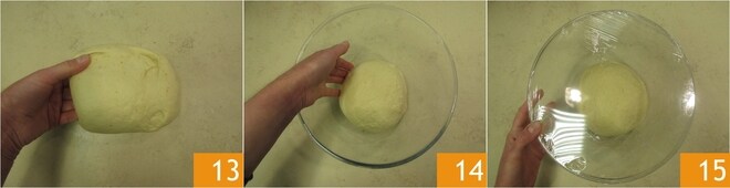 Übertragen Sie den Teig auf die Arbeitsfläche 13 und formen Sie ihn mit den Händen zu einer Kugel. Legen Sie den Teig in eine große Schüssel 14, decken Sie ihn mit Folie ab und lassen Sie ihn etwa 3 Stunden bei Raumtemperatur gehen.
