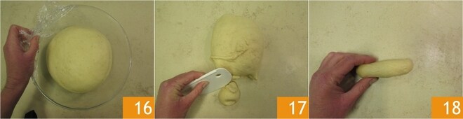 Wenn der Teig sein Volumen verdoppelt hat 16, übertragen Sie ihn auf eine leicht gebutterte Fläche. Beginnen Sie nun mit der Formung der Häschen. Aus dem Teig müssen Sie 10 Stück à 50 g für die Körper der Häschen, 20 Stück à 20 g für die Ohren und Gesichter und 10 Stück à 5 g für die Schwänzchen 17 herausnehmen. Beginnen Sie mit dem ersten Häschen. Nehmen Sie eines der 50 g-Stücke und fangen Sie an, es zu einem Strang zu formen 18.