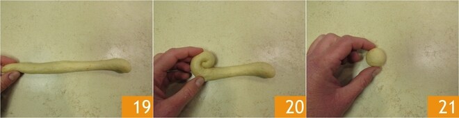 Wenn Sie einen etwa 15 cm langen Strang erhalten haben 19, beginnen Sie, ihn aufzurollen 20, ohne das letzte Stückchen aufzurollen. Machen Sie nun das Gesicht des Häschens, nehmen Sie eines der 20 g-Stücke und formen Sie eine Kugel 21.