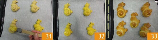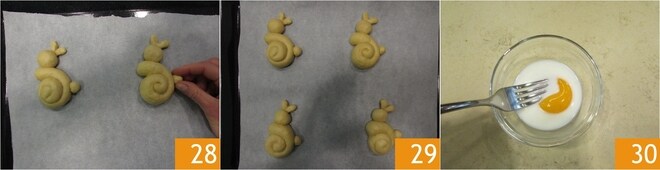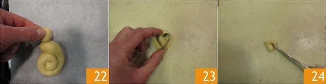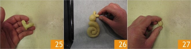 Platzieren Sie die Kugel unten rechts und drücken Sie leicht 28. Wiederholen Sie den Vorgang, bis Sie 10 Häschen geformt haben, verteilen Sie sie auf zwei Blechen, mit genügend Abstand zueinander. Lassen Sie sie 60 Minuten bei Raumtemperatur ohne Zugluft gehen 29. Zu diesem Zeitpunkt schlagen Sie das Eigelb mit der Sahne zusammen 30