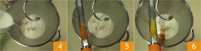 Fügen Sie auch die Milch 4, die geriebene Orangenschale 5 und die geriebene Zitronenschale 5 hinzu.