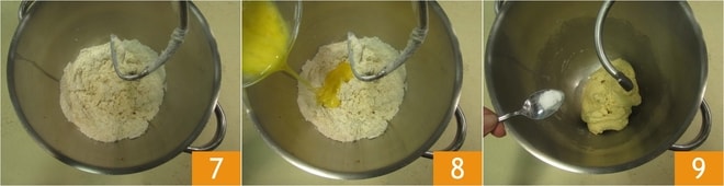 Starten Sie die Küchenmaschine und arbeiten Sie die Zutaten mit dem Knethaken 7. Wenn sie vermischt sind, fügen Sie die Eier bei Raumtemperatur hinzu 8 und arbeiten Sie, bis Sie einen elastischen und gleichmäßigen Teig erhalten haben. Fügen Sie eine Prise Salz hinzu 9.