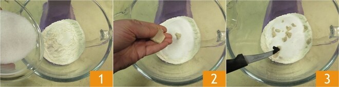 Um die Brioche zuzubereiten, beginnen Sie mit dem Teig. Geben Sie das Mehl und den Zucker in die Schüssel einer Küchenmaschine mit Knethaken 1. Fügen Sie die zerbröckelte Hefe 2 und die Samen einer Vanilleschote hinzu 3