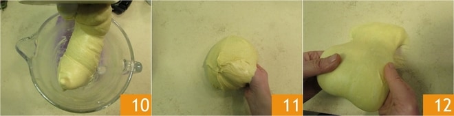 Wenn der Teig wieder gut gebunden ist 10, übertragen Sie ihn auf eine Arbeitsfläche 11. Er könnte sehr klebrig sein: Geben Sie ein paar Falten wie bei der Slap & Fold-Methode, ohne ihn zu schlagen. Dazu heben Sie den Teig vorsichtig an, dehnen ihn und falten ihn über sich selbst 12. Sollte er zu klebrig sein, warten Sie zwei Minuten und wiederholen Sie den Faltvorgang.