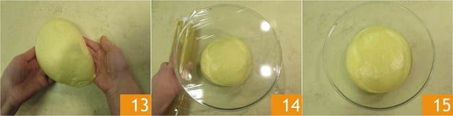 Rundwirken Sie dann den Teig, indem Sie sich mit einem Teigschaber helfen, um ihn gut von der Arbeitsfläche zu lösen und eine Kugel zu formen 13, und legen Sie ihn in eine große Schüssel. Decken Sie ihn mit Frischhaltefolie ab 14 und lassen Sie den Teig bei einer Temperatur von 26 bis 28°C für 3,5 Stunden gehen. Ideal wäre ein ausgeschalteter Ofen mit eingeschaltetem Licht und einem Topf mit heißem Wasser auf dem Boden des Ofens. Wenn Sie diese Möglichkeit nicht haben und den Teig bei Zimmertemperatur, geschützt vor Zugluft, bei einer niedrigeren Temperatur liegen lassen, kann es länger dauern. Sobald sich der Teig verdoppelt hat 15,