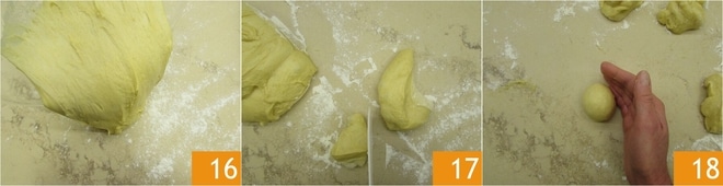 kippen Sie ihn auf die Arbeitsfläche 16 und schneiden Sie 18 Stücke zu je 50 g ab 17. Nehmen Sie das erste Stück und geben Sie dem Teig Kraft, indem Sie schnell Falten machen, heben Sie dann einen äußeren Rand des Teigs an und bringen Sie ihn zur Mitte. Wiederholen Sie diesen Vorgang mehrmals. Rundwirken Sie die Teigstücke schnell, um Kugeln zu erhalten 18.