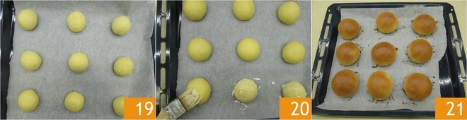 Legen Sie sie auf ein mit Backpapier ausgelegtes Blech 19. Lassen Sie sie noch eine Stunde gehen. Schlagen Sie das Eigelb mit etwas Sahne und verwenden Sie es, um die Oberfläche zu bestreichen 20. Backen Sie sie im vorgeheizten statischen Ofen bei 180°C für 20 Minuten. Nehmen Sie sie aus dem Ofen 21, lassen Sie sie abkühlen und servieren Sie sie.